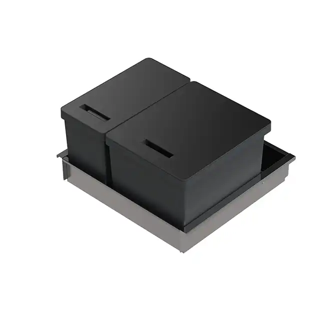 | Código | Módulo | Largura (mm) | Profundidade (mm) | Altura (mm) | Abertura | Baldes - volume total (L) | Baldes - número | Baldes | Acabamento | Stock | Preço |